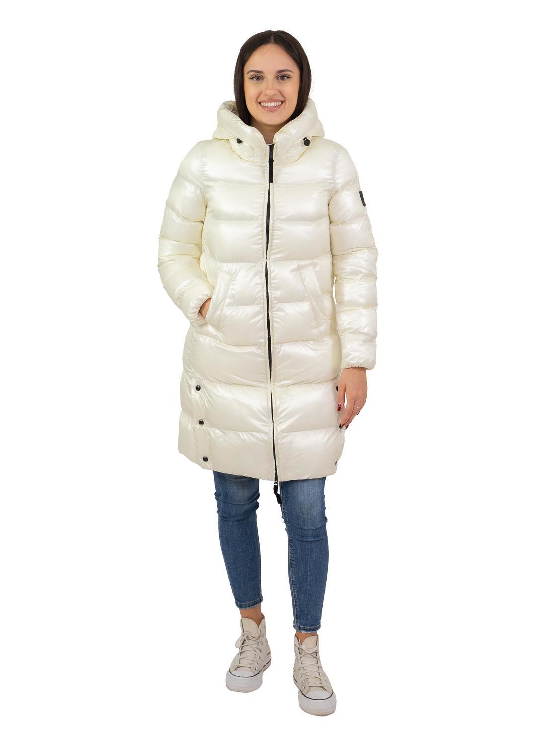 Durchgehender zentraler Reißverschluss mit doppeltem Schieber, Stehkragen mit Zugbändern und Seitentaschen.